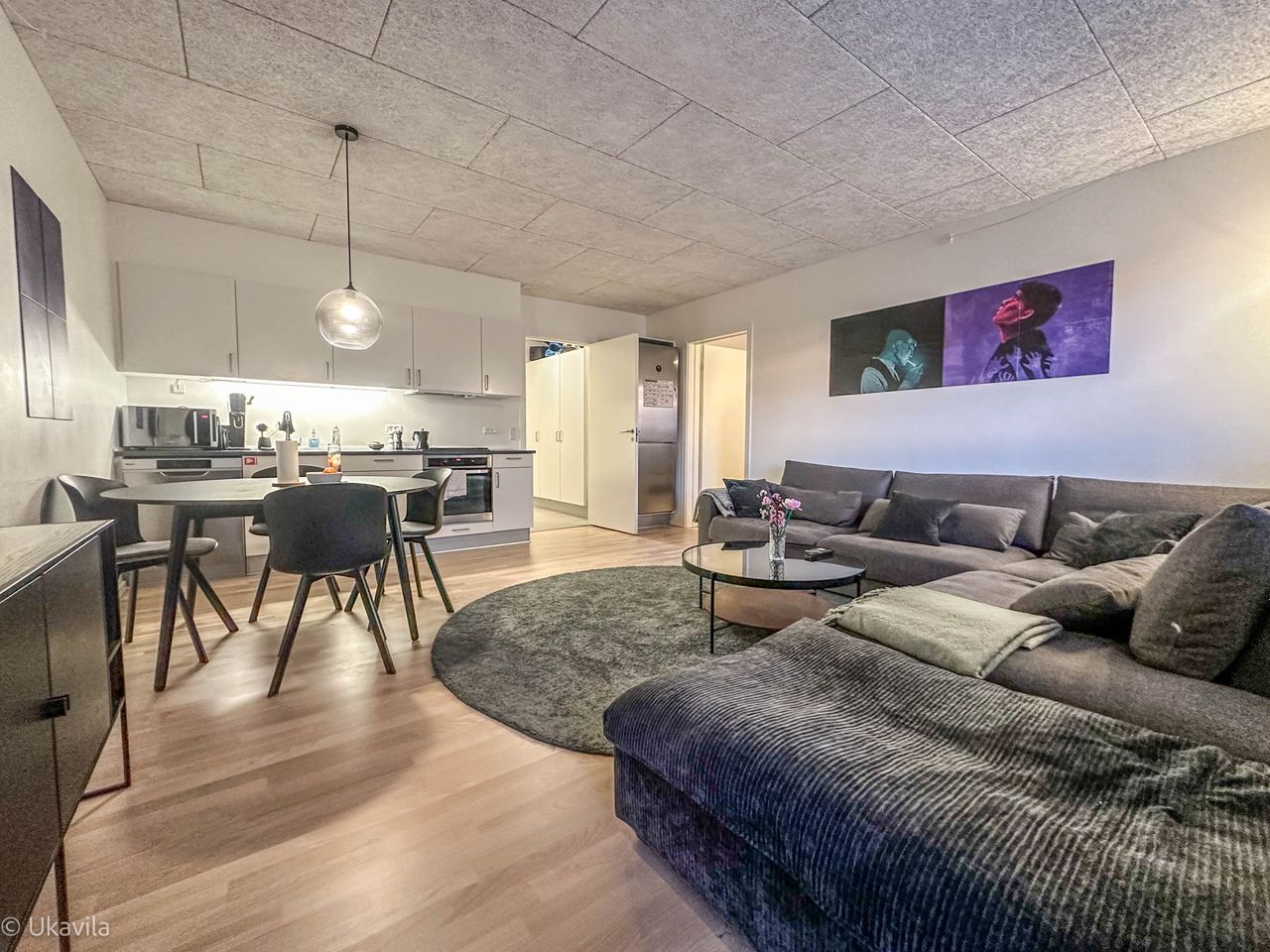 Lejligheden byder på et stilrent køkken i åben forbindelse med stuen, hvor der er plads til både spisebord og stuearrangement. De gode vinduespartier sikrer et flot lysindfald og skaber en behagelig atmosfære i boligen.