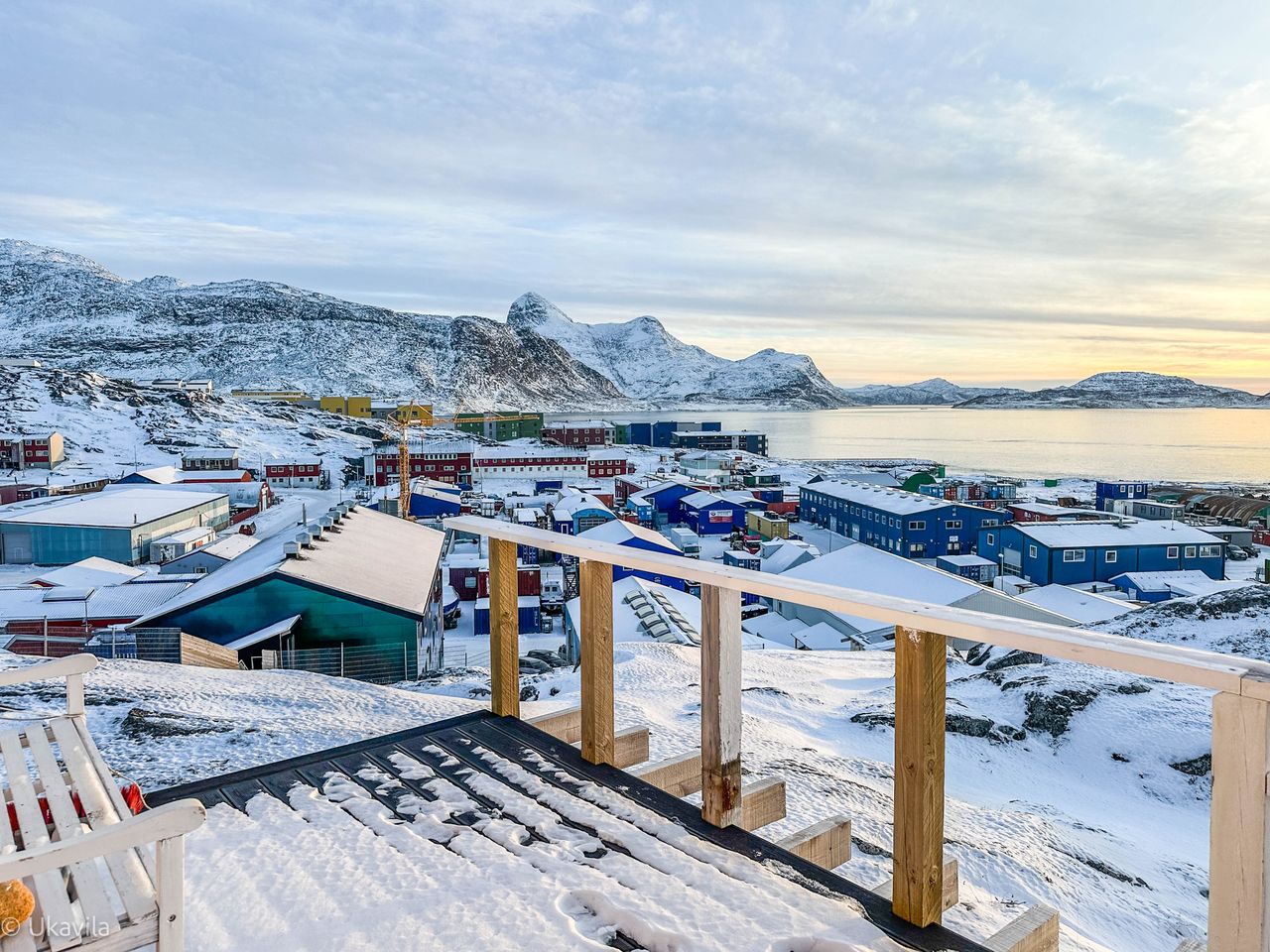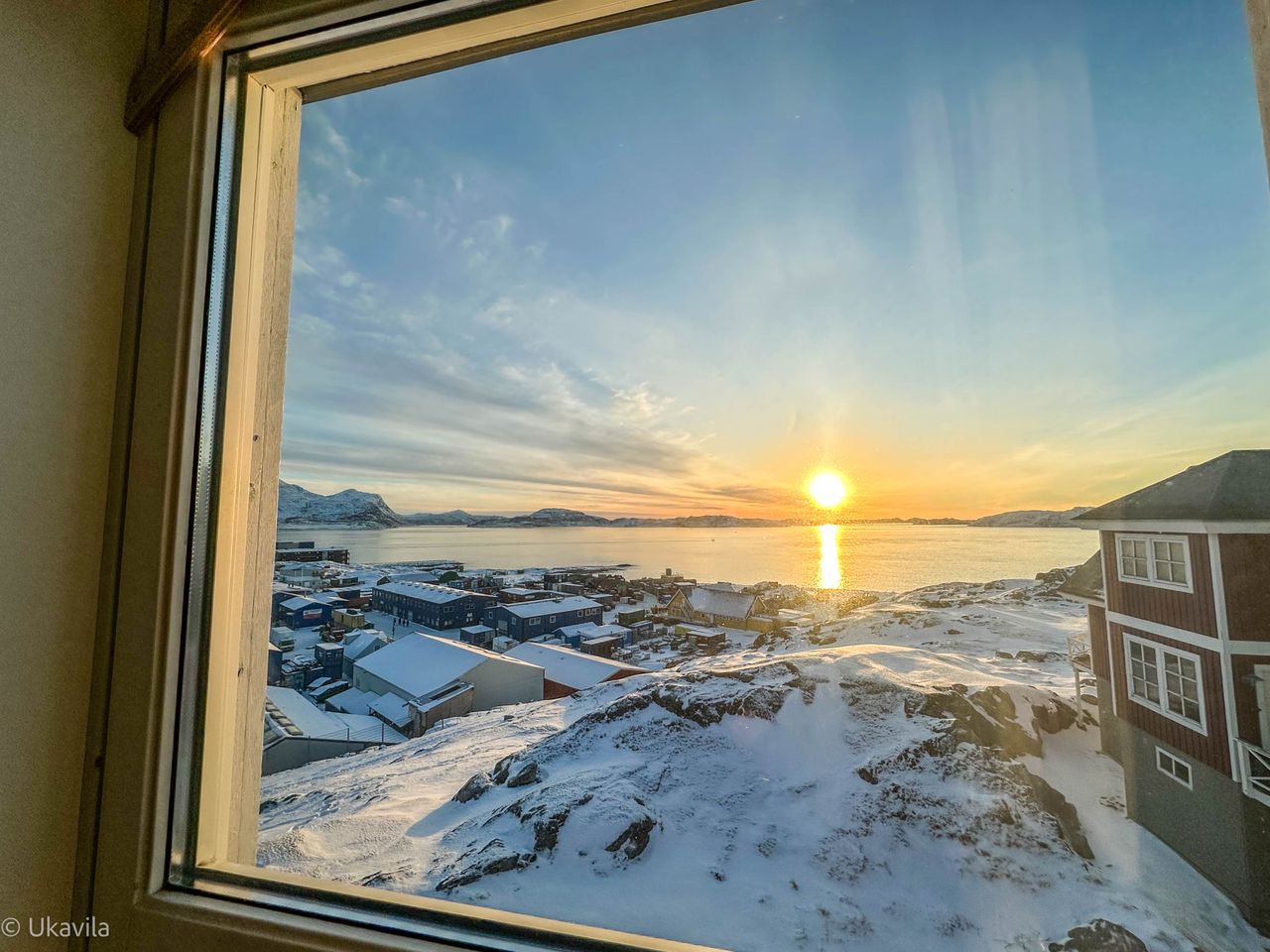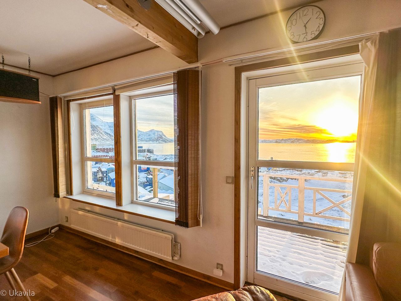 De lyse opholdsrum har direkte udgang til en sydvendt terrasse, hvor udsigten over Nuuks indsejling og de omkringliggende øer kan nydes fra morgen til aften. Mod øst åbner boligen sig mod de majestætiske fjelde Ukkusissat og Kingittorsuaq, som danner en imponerende og stemningsfuld kulisse året rundt.