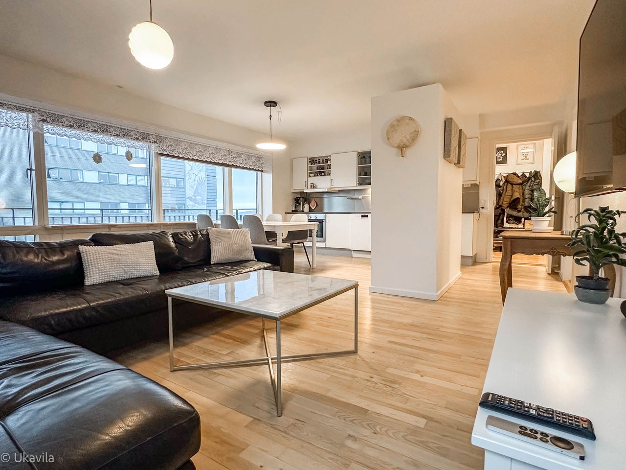 Beliggenheden er svær at slå: Du bor bogstaveligt talt et stenkast fra bymidten, indkøb, caféer og hverdagens nødvendigheder – samtidig med at fjorden og den omkringliggende natur sikrer en rolig og smuk udsigt fra hjemmet. Det bliver ikke nemmere at bo praktisk og behageligt på én gang.