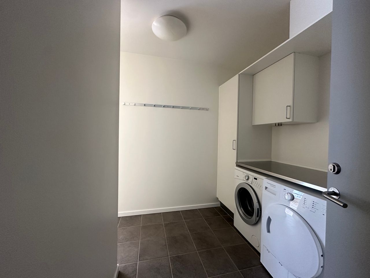 Køkkenet fremstår moderne med granitbordplade, og boligen har gennemgående sorte klinker, som giver et stilrent og eksklusivt udtryk.