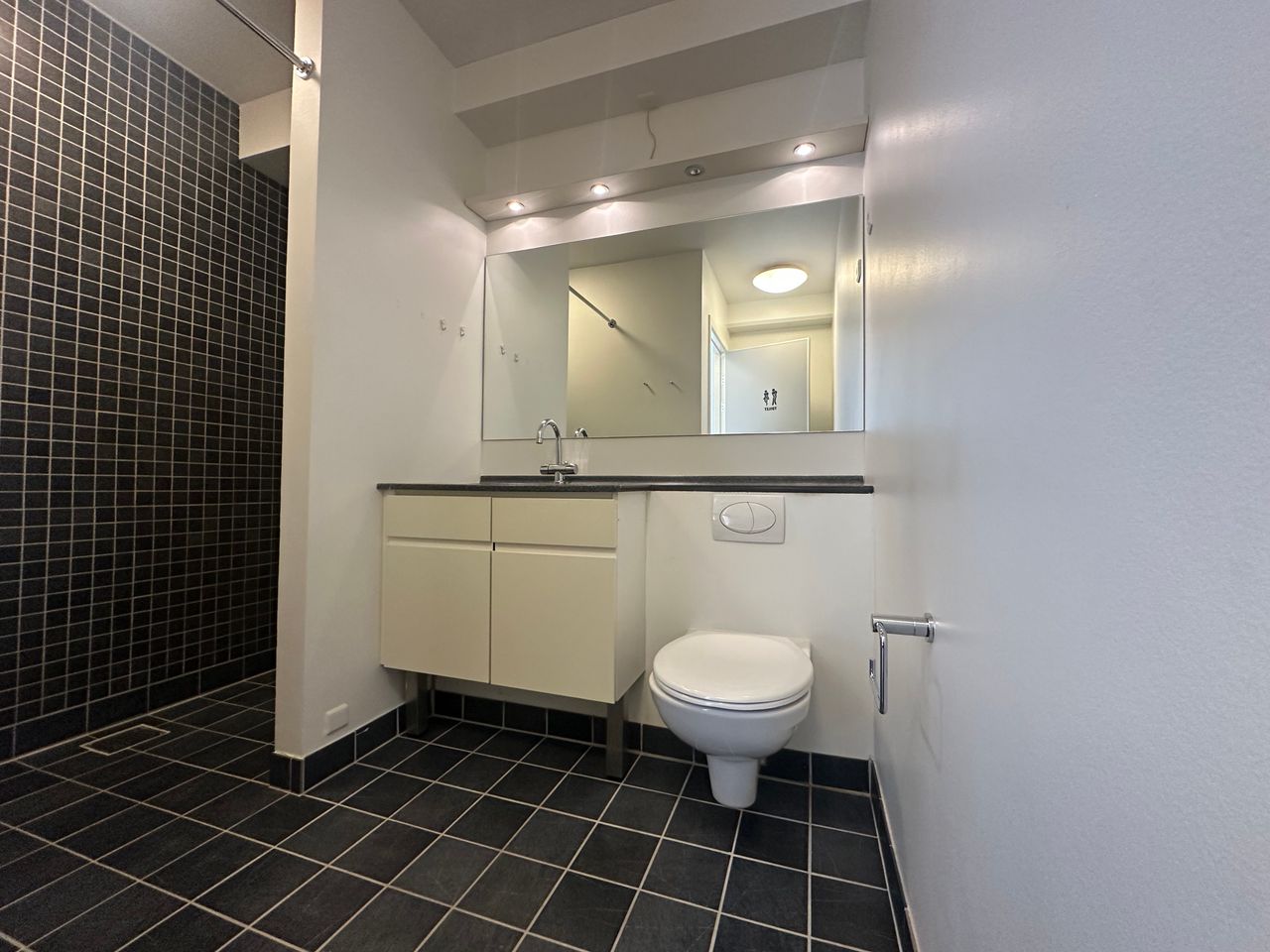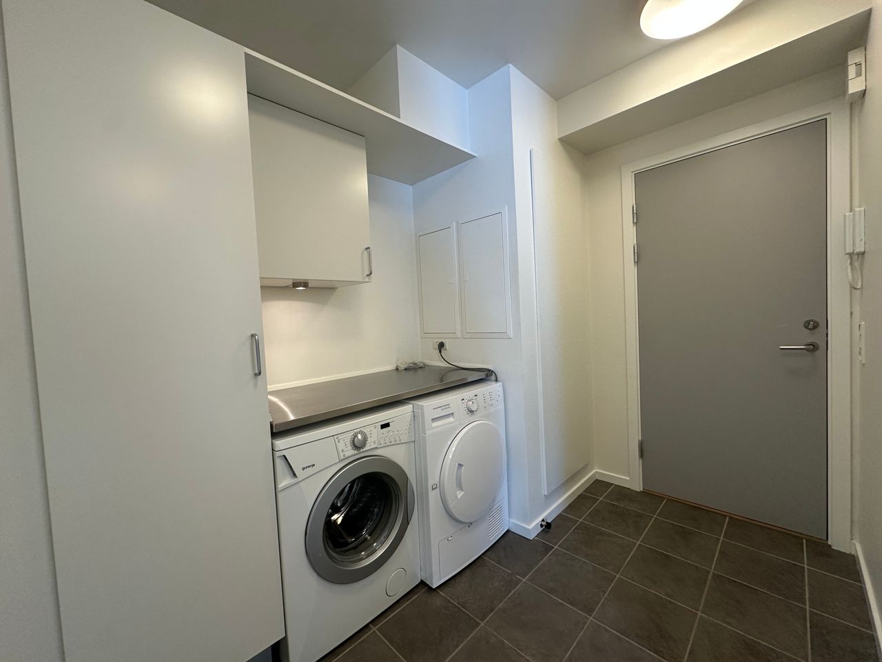 Køkkenet fremstår moderne med granitbordplade, og boligen har gennemgående sorte klinker, som giver et stilrent og eksklusivt udtryk.
